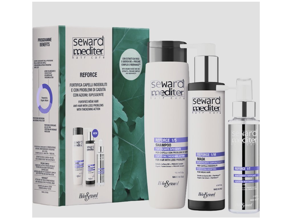 Helen Seward Mediter Reforce Shampoo – Posilující šampon 1/S 300 ml: Tento revitalizační šampon šetrně čistí vlasy a pokožku hlavy. Jeho speciální složení, obohacené o organický extrakt z rakovy a komplex PROCARE, proniká do vlasového vlákna, kde začíná proces jeho obnovy a posílení. Připravuje vlasy a pokožku na optimální vstřebání aktivních látek z dalších kroků kúry. Helen Seward Mediter Reforce Mask – Intenzivní posilující maska 1/M 200 ml: Vysoce koncentrovaná maska je klíčová pro hloubkovou regeneraci délek a konečků. Její bohatá textura intenzivně vyživuje, restrukturalizuje poškozené vlasové vlákno zevnitř a posiluje jeho odolnost proti lámání. Aktivní látky organický extrakt z dubu a FIBERHANCE vlasy hydratují, uhlazují, dodávají jim lesk a usnadňují rozčesávání. Helen Seward Mediter Reforce Tonic – Revitalizační a posilující tonikum 1/T 100 ml: Třetí, avšak neméně důležitý krok, se zaměřuje přímo na vlasovou pokožku a kořínky. Toto lehké, bezoplachové tonikum organický extrakt z rukoly a komplex PROCARE stimuluje mikrocirkulaci pokožky hlavy, dodává energii vlasovým folikulům a podporuje zdravý růst vlasů. Pomáhá posilovat vlasy od samého základu, může působit proti nadměrnému vypadávání a celkově revitalizuje pokožku hlavy.